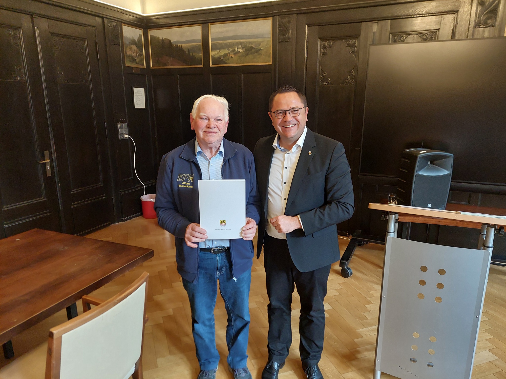 Foto : Alfons Blumenkamp links neben Landrat Marco Voge, nahm bei der Verleihung des Heimatpreises den 2 Platz für die Eisenbahnfreunde Hönnetal e.V. entgegen. Gerade Alfons hat mit seiner langjährigen Arbeit an der Modellbahn erst dieses Erfolg möglich gemacht.